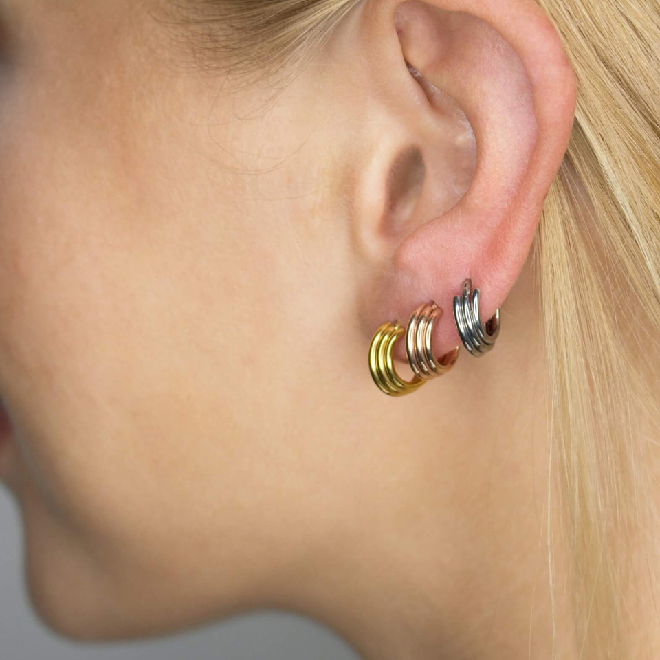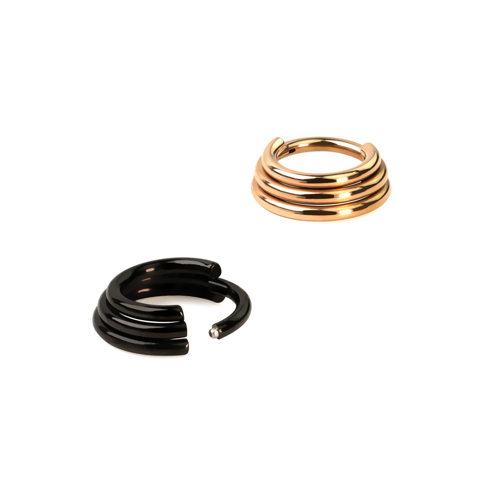 Mimo, że biżuteria ta nazywana jest trzywarstwowym kółkiem, w rzeczywistości składa się ona z 3 indywidualnych kółek, które są zespawane i połączone w całość. Tylko środkowe kółko jest kompletne, natomiast w pozostałych dwóch jedna część została usunięta, dlatego w przekłuciu znajduje się tylko jedno kółko.