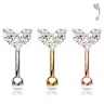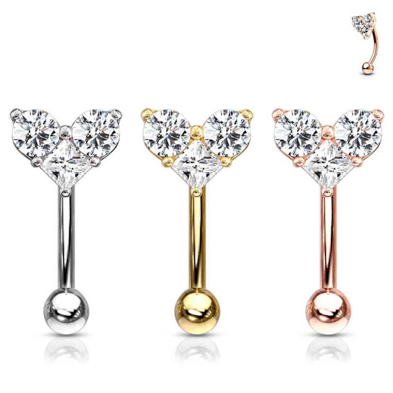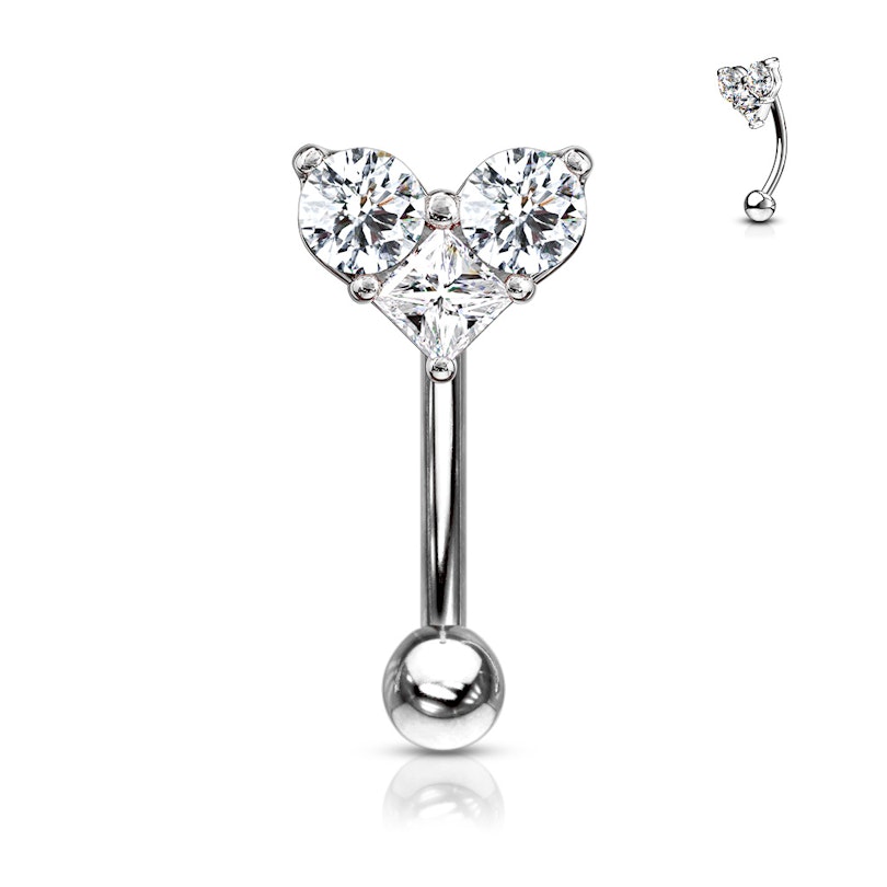 Pręcik nie jest zbyt długi i na dole zakończony jest kulką o średnicy 3 mm. Na górze widać trzy, przezroczyste cyrkonie (dwie są okrągłe a jedna kwadratowa). Wydaje się, że całość przypomina swoim kształtem serce lub głowę ptaka.
