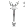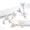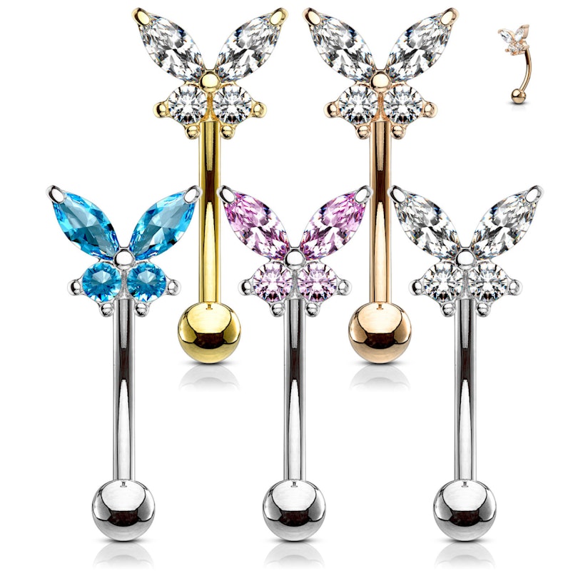 Jeśli szukasz zakrzywionego kolczyka - mamy dla Ciebie idealne rozwiązanie. Prezentowana na zdjęciu biżuteria, zdobiona jest uroczym motylem. Jego skrzydła tworzy para okrągłych i podłużnych kamieni. Możesz zdecydować o ich kolorze - wystarczy, że sprawdzisz dostępne obok zdjęcia. Kamienie są utrzymywane przez małe ramiona i nie są doklejane. Mimo to, nie radzimy nosić tego kolczyka podczas kąpieli.