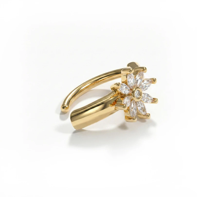 To stylowe kółko clicker zdobione jest błyszczącym kwiatem w swojej centralnej części. Kwiat składa się z 9 sześciennych cyrkonii. Kolczyk jest dostępny w złotej lub srebrnej wersji.