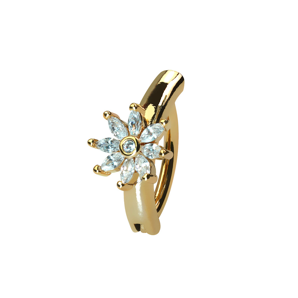 To stylowe kółko clicker zdobione jest błyszczącym kwiatem w swojej centralnej części. Kwiat składa się z 9 sześciennych cyrkonii. Kolczyk jest dostępny w złotej lub srebrnej wersji.