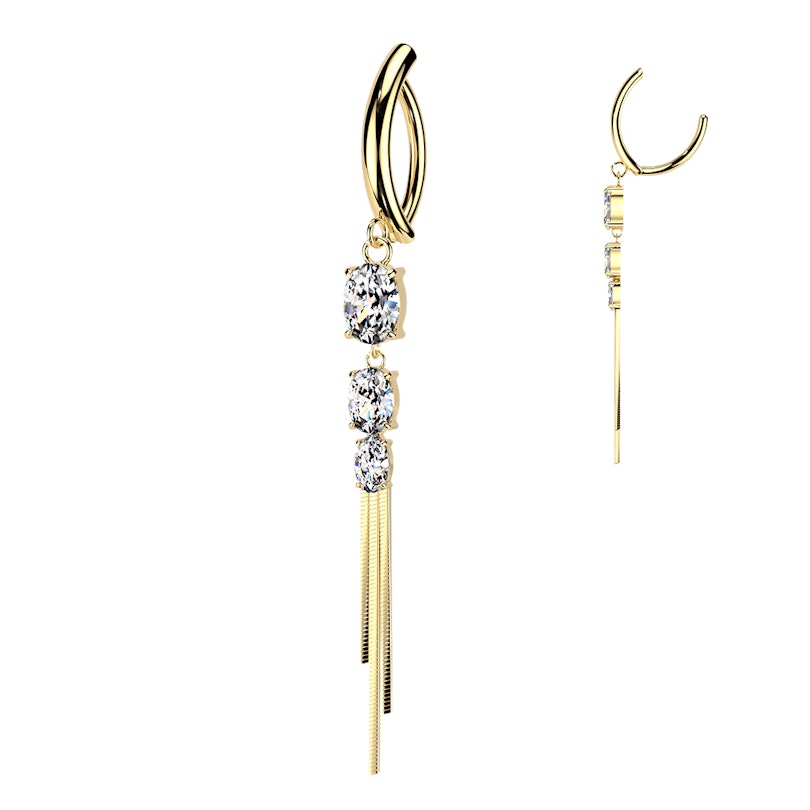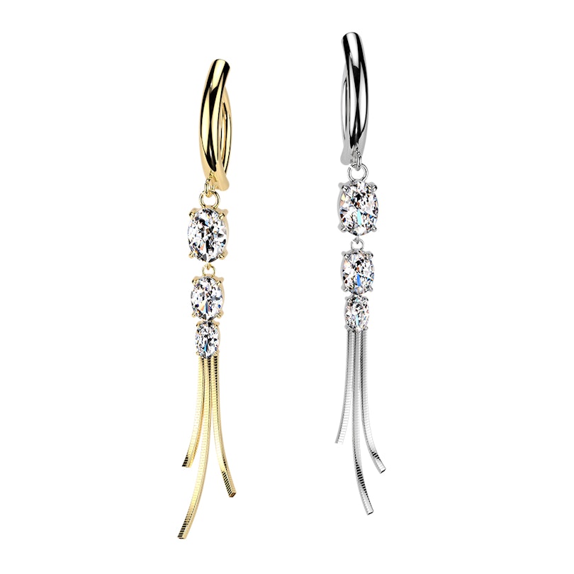 Clicker do pępka z kamieniami i łańcuszkami dodaje twojemu piercingowi ekstra detali. Kamienie siedzą centralnie w schludnej oprawie łapkowej, a cienkie łańcuszki zwisają poniżej, dając bardziej dopracowany wygląd. Dostępny w złotym i srebrnym kolorze, to biżuteria, po którą sięgasz, gdy chcesz czegoś więcej niż prosta sztanga.