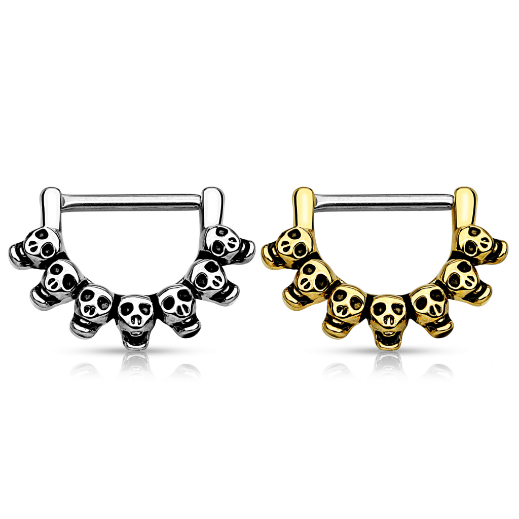 Wzór czaszek, którym zdobiony jest clicker kojarzy się z meksykańskich dniem zmarłych. W naszym projekcie są one uśmiechięte i ułożone symetrycznie w dolnej części kolczyka, co sprawia że ozdobią sutek pod spodem.