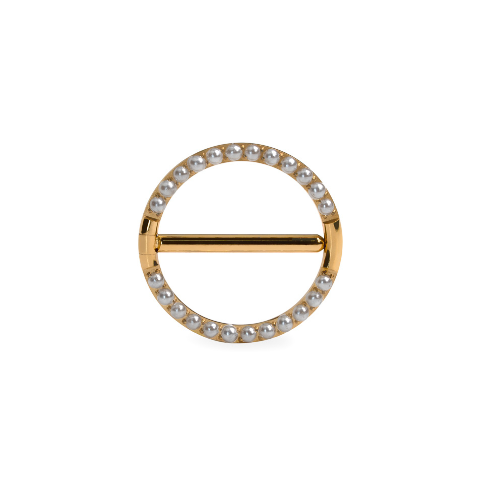 Tytanowy clicker do sutka wysadzany perłami udowadnia, że perły nie nadają się wyłącznie do naszyjników. Koło z perłami w złotej lub srebrnej oprawie podkreśli piercing i doda mu charakteru.