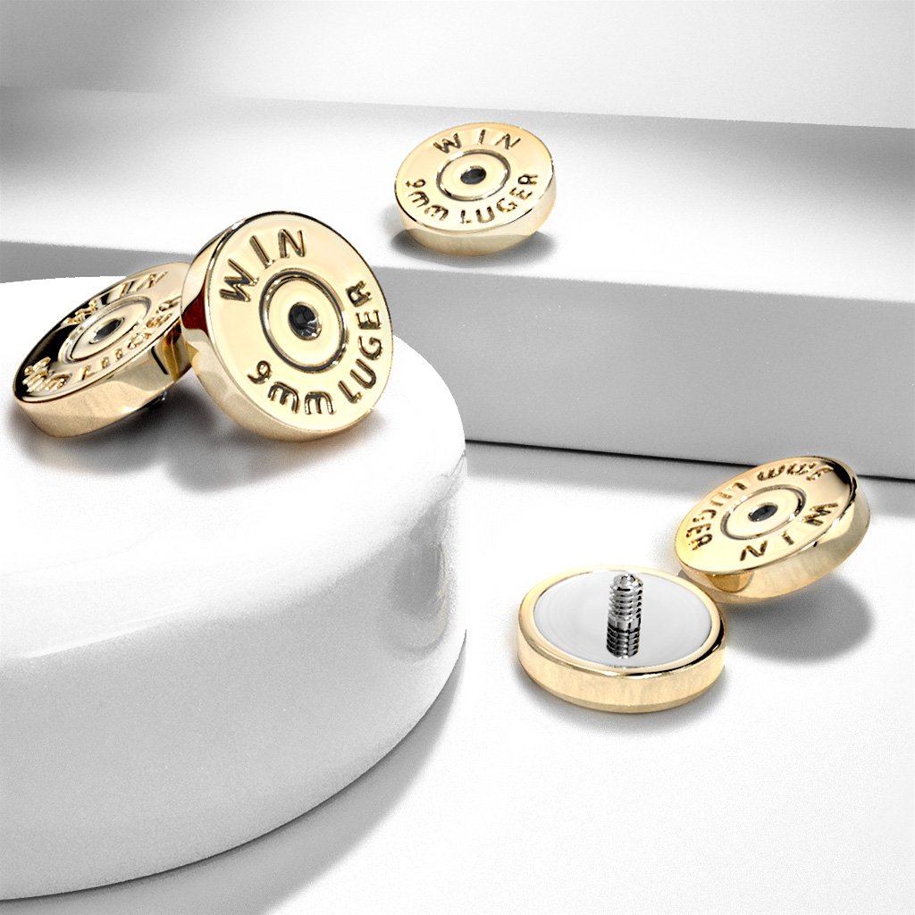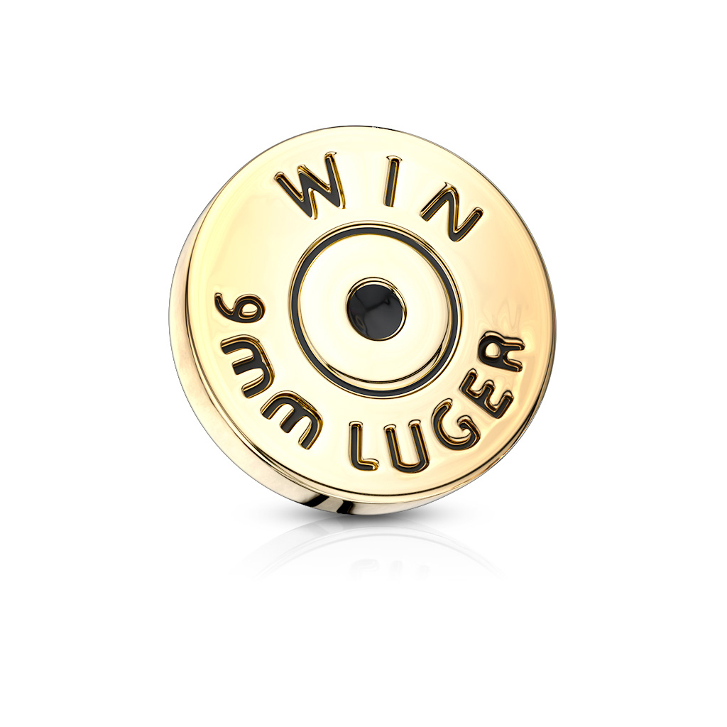 Część kolczyka wchodząca do Twojej skóry, została wykonana ze stali chirurgicznej. Ozdoba - nabój - jest wykonana z mosiądzu i pokryta złotą powłoką, dzięki czemu wygląda jak prawdziwy. Kolczyk ma około 7 mm - więc jest też mnóstwo miejsca na wygrawerowany tekst, który można zobaczyć na obrazku wyżej.