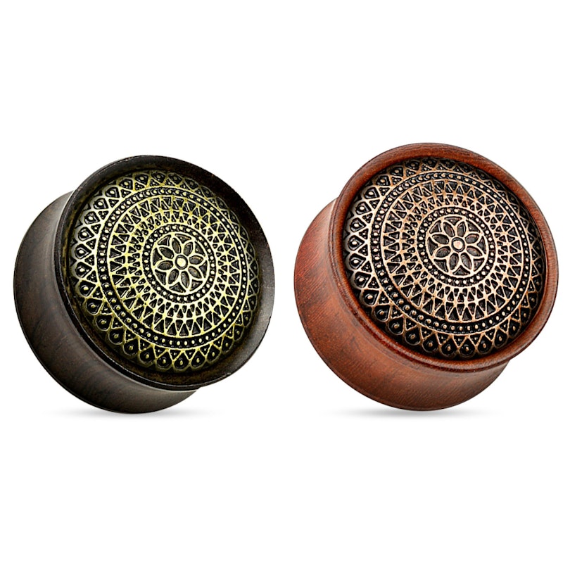 Spraw aby twoje rozciąganie stało się bardziej wyjątkowe, dzięki temu drewnianemu plugowi ze złotymi wzorami. W centralnej jego części widać mały kwiat, otoczony zmieniającym się, symetrycznym zdobieniem.