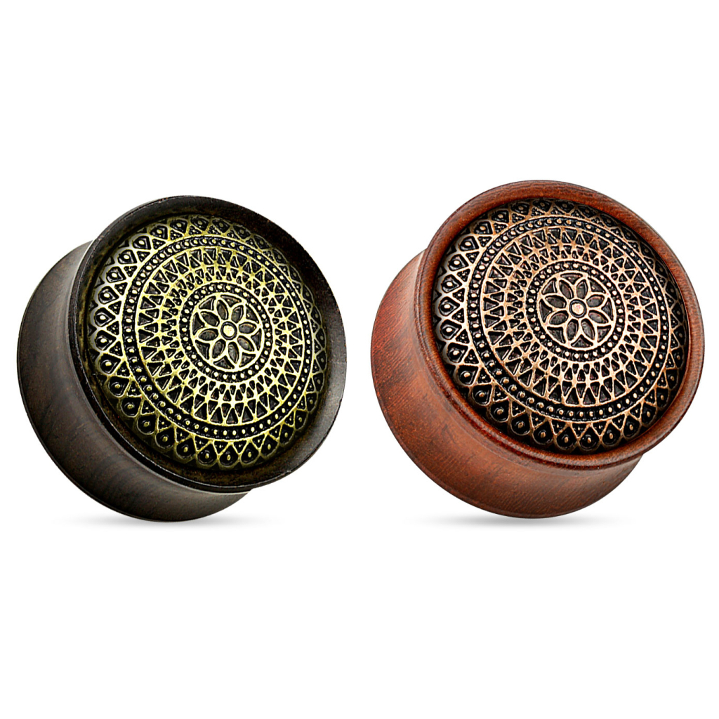 Spraw aby twoje rozciąganie stało się bardziej wyjątkowe, dzięki temu drewnianemu plugowi ze złotymi wzorami. W centralnej jego części widać mały kwiat, otoczony zmieniającym się, symetrycznym zdobieniem.