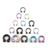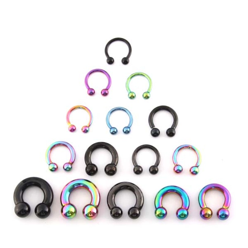 Jeśli chcesz dodać koloru swojemu przekłuciu, u nas masz okazję zamówić tę dużą podkowę, której najmniejsza grubość pręcika wynosi 2 mm i możesz ją wybrać w ulubionym kolorze. W przypadku rozmiarów większych niż 2,5 mm dostępna jest w dwóch najpopularniejszych kolorach: czarnym i wielokolorowym, które oferujemy do grubości 6,5 mm.