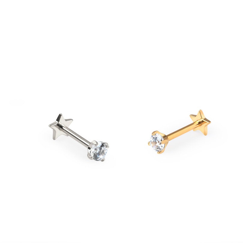 Ten labret z tytanu wyposażony jest w płaski tył w kształcie gwiazdki, doskonały do piercingów helix lub w płatku ucha, gdzie widać tył biżuterii.