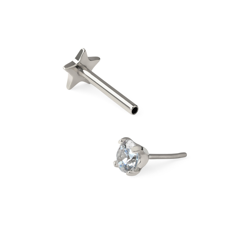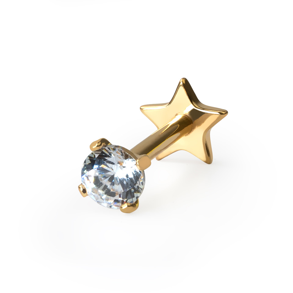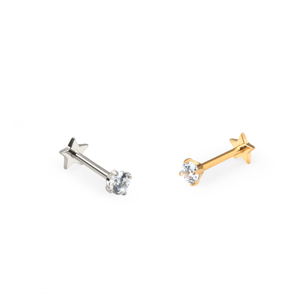 Ten labret z tytanu wyposażony jest w płaski tył w kształcie gwiazdki, doskonały do piercingów helix lub w płatku ucha, gdzie widać tył biżuterii.