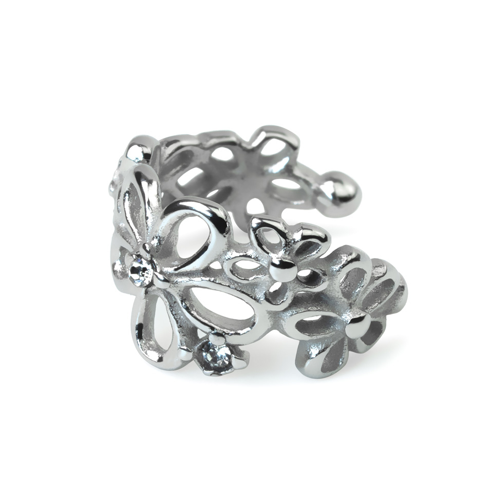 Ta delikatna nausznica do ucha prezentuje proste kwiaty w różnych rozmiarach, które owijają się wokół ucha. W środku większych kwiatów znajdują się małe kamienie, które nadają temu projektowi subtelnego połysku. Końcówki tej nausznicy zakończone są małymi kuleczkami, co sprawia, że jest ona wygodna w noszeniu. Projekt ten wykonany jest ze stali chirurgicznej, dzięki czemu nie matowieje i nie odbarwia skóry. Świetny element do rozbudowy kompozycji ucha bez potrzeby dodatkowego przekłucia.