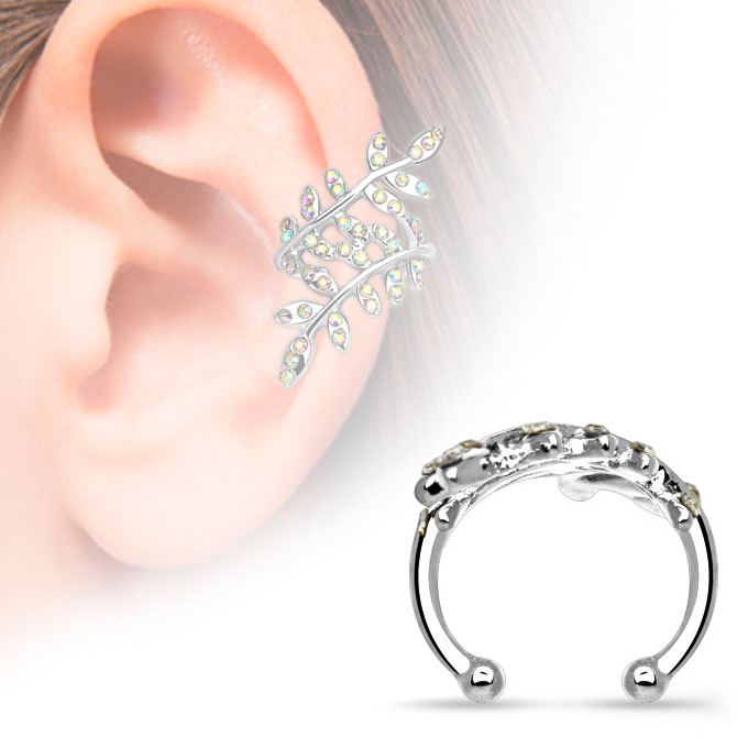Szukasz wyjątkowej biżuterii do ucha, która będzie się wyróżniać? Spójrz na ten prezentowany model, nie dość że ma przepiękny wzór w formie liści wysadzanych kamieniami, to możesz go nosić bez prawdziwego piercingu.