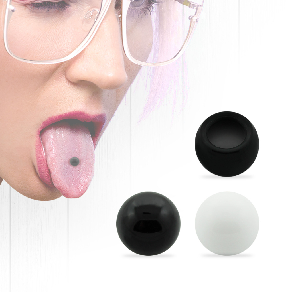 Na zdjęciu powyżej widzisz fake kolczyk do języka. Rozumie się samo przez się, że nie wymaga on posiadania przekłucia języka. Idealnie nadaje się do testowania, czy kolczyk w języku jest dla ciebie. Jest dostępny w dwóch klasycznych kolorach, białym i czarnym. Kulka jest wykonana z akrylu, z małą dziurką z jednej strony. Ta dziurka pomaga stworzyć próżnię, która utrzymuje kolczyk na miejscu.