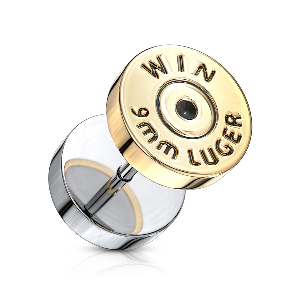 Przedstawiamy fake plug z tyłem naboju. Plug jest fałszywy, ale daje złudzenie, że masz rozepchane ucho do 10 mm. Możesz go nosić jeśli masz zwykłą dziurkę o rozmiarze 1,2 mm. Ze względu na rozmiar końcówki, jest też miejsce na wystrzałowy tekst - szkoda byłoby, gdyby biżuteria była tak mała, że ledwie można było zobaczyć lub przeczytać tekst.