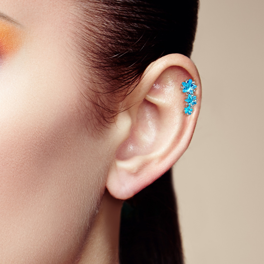 Każda z gwiazdek ma inny rozmiar, największa znajduje się na górze, natomiast najmniejsza na dole. Z daleka sprawia wrażenie zaognionej gwiazdy, którą możesz wybrać w turkusowej lub przezroczystej wersji. Tylko ty decydujesz, który model znajdzie się w twoim zamówieniu. Nie czekaj i już dziś stań się właścicielem tej stylowej biżuterii do helixa.