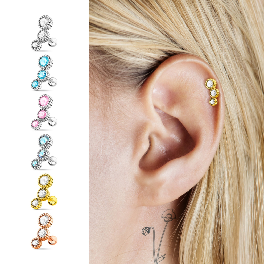 Nazwa: Kolczyk do helixa z trzema okrągłymi kamieniami w różnych rozmiarach