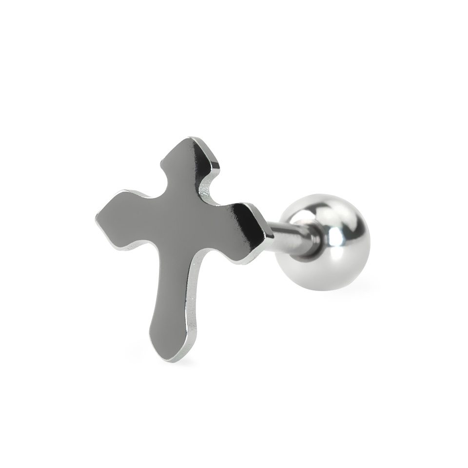 Na górze zamiast kulki jest zdobiony krzyżem, który jest na stałe przyczepiony do kolczyka. Na dole zamykany jest kulką o rozmiarze 5 mm. Krzyżyk ma 2,5 mm wysokości, 10 mm grubości i 12 mm długości.