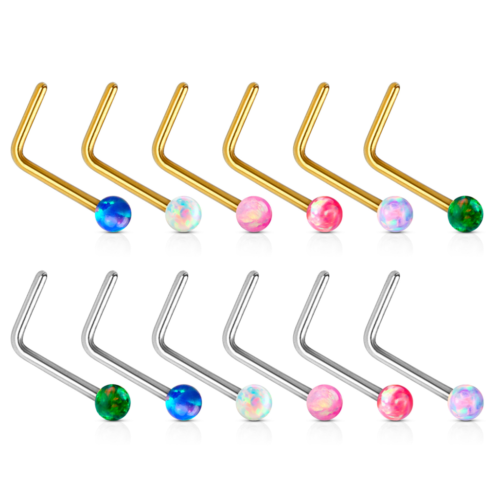 Piercing do nosa wykonany jest z 14-karatowego złota, gdzie wybierasz, czy chcesz wariant ze zwykłego, żółtego złota, czy wariant białego złota. Oba modele zawierają tyle samo złota, więc nie ma różnicy w cenie. Nawet w obu modelach występują takie same opale z przodu. Kamień to syntetyczny opal wykonany z mieszanki mieszanki żywic. Tutaj również wybierasz kolor, który chcesz.