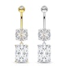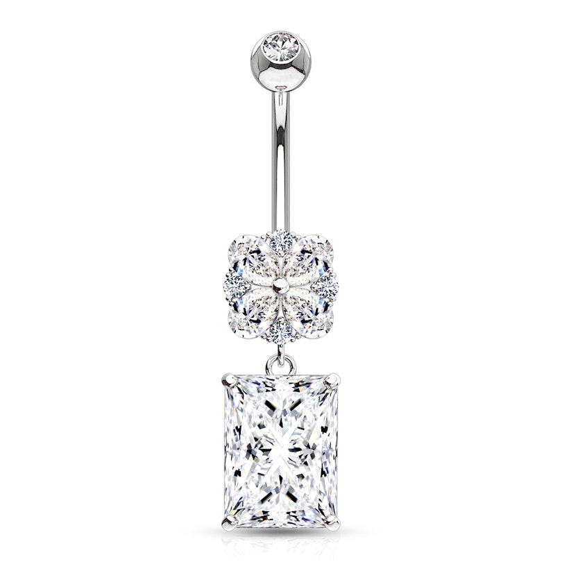 Ten piękny i elegancki kolczyk do pępka jest wykonany z 14 karatowego złota i można powiedzieć, że należy do świata księżniczek. Jest udekorowany dużym, prostokątnym kamieniem w zawieszce o szlifie Asschera. Ten rodzaj szlifu ma więcej niż 100 lat i narodził się on podczas gdy bracia Asscher otrzymali zlecienie od holenderskiej rodziny królewskiej aby wyrzeźbić największy diament świata.