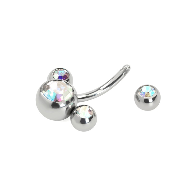Podobnie jak większość kolczyków do pępka ma pręcik długości 10 mm, oraz zakończony jest górną i dolną kulką. Jedyną różnicą to taka, że do dolnej kulki są doczepione po bokach dwie mniejsze. Wszystkie z nich zdobione są kolorowymi kamieniami i możesz oczywiście wybrać jeden z 7 dostępnych kolorów.