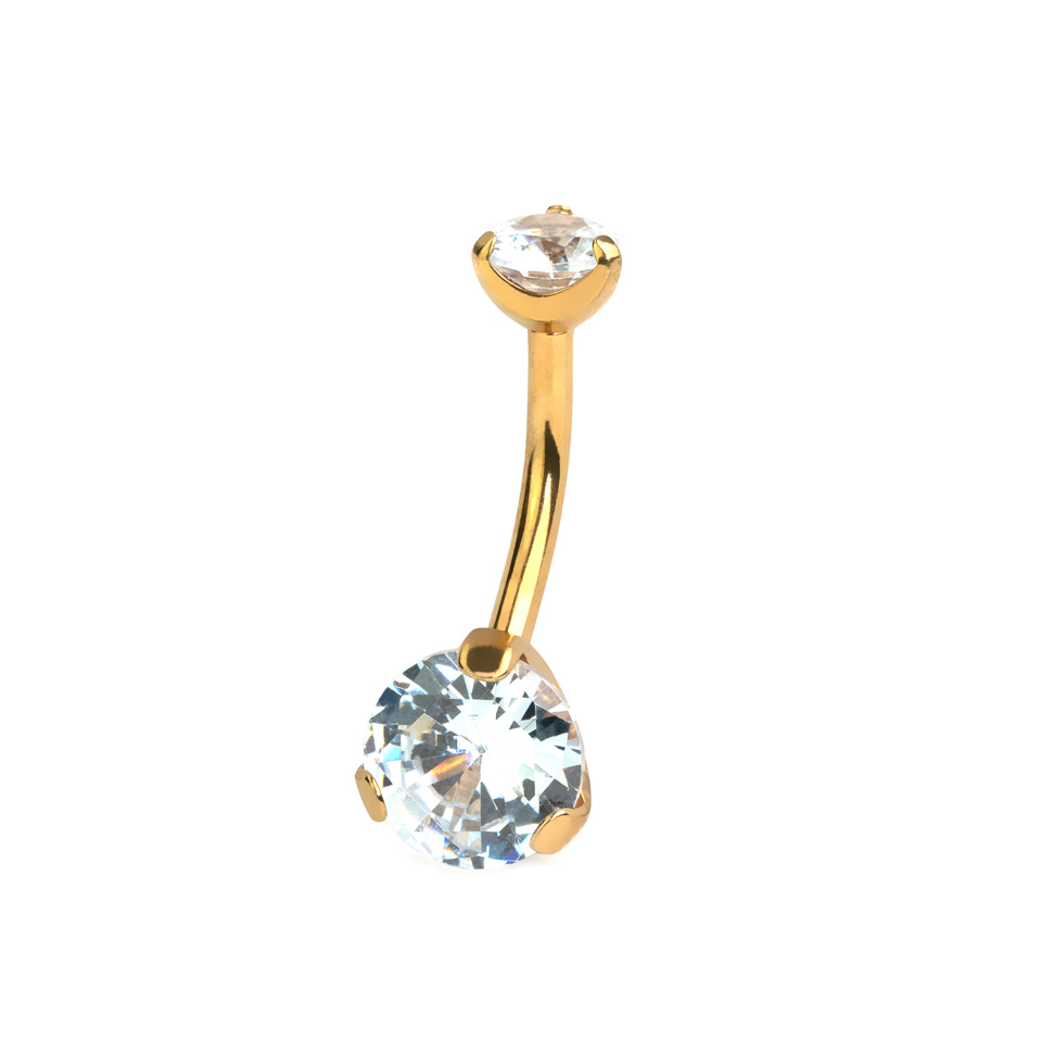 Jeśli lubisz biżuterię do pępka z dużymi kamieniami, to jesteś we właściwym miejscu. Na zdjęciu powyżej prezentujemy kolczyk wykonany ze stali chirurgicznej o różnych kolorach. Zarówno górna jak i dolna kulka zdobione są uroczą cyrkonią, której szlif pozwala na osiągnięcie pięknego blasku. Cyrkonie są utrzymywane w kolczyku za pomocą małych pazurków, które nie pozwolą jej wypaść.