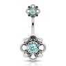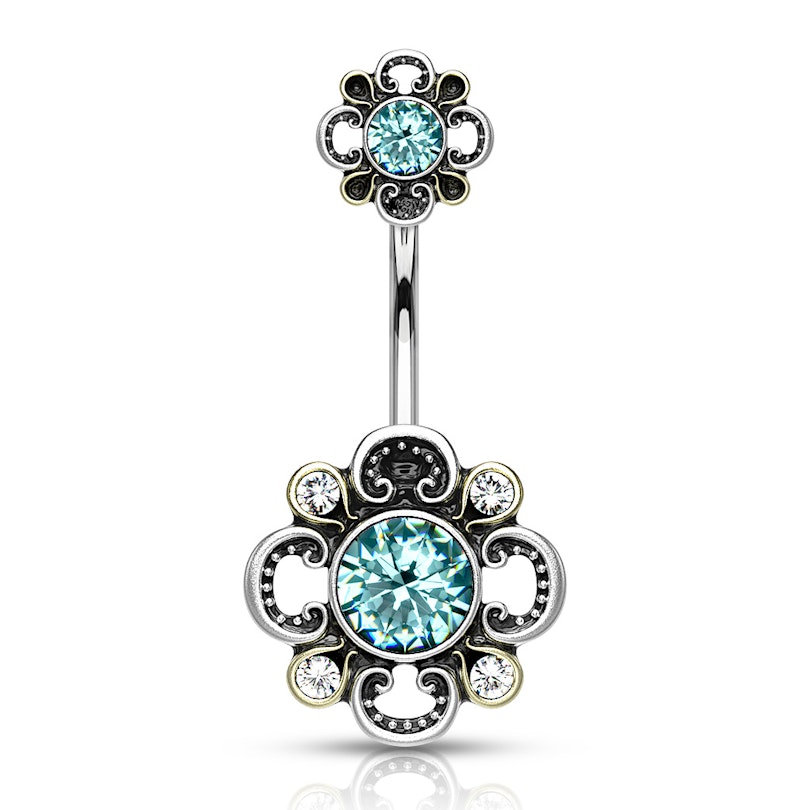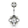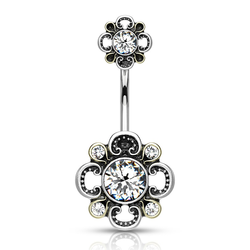 Kolczyk do pępka z filigranowym kwiatem i kamieniami