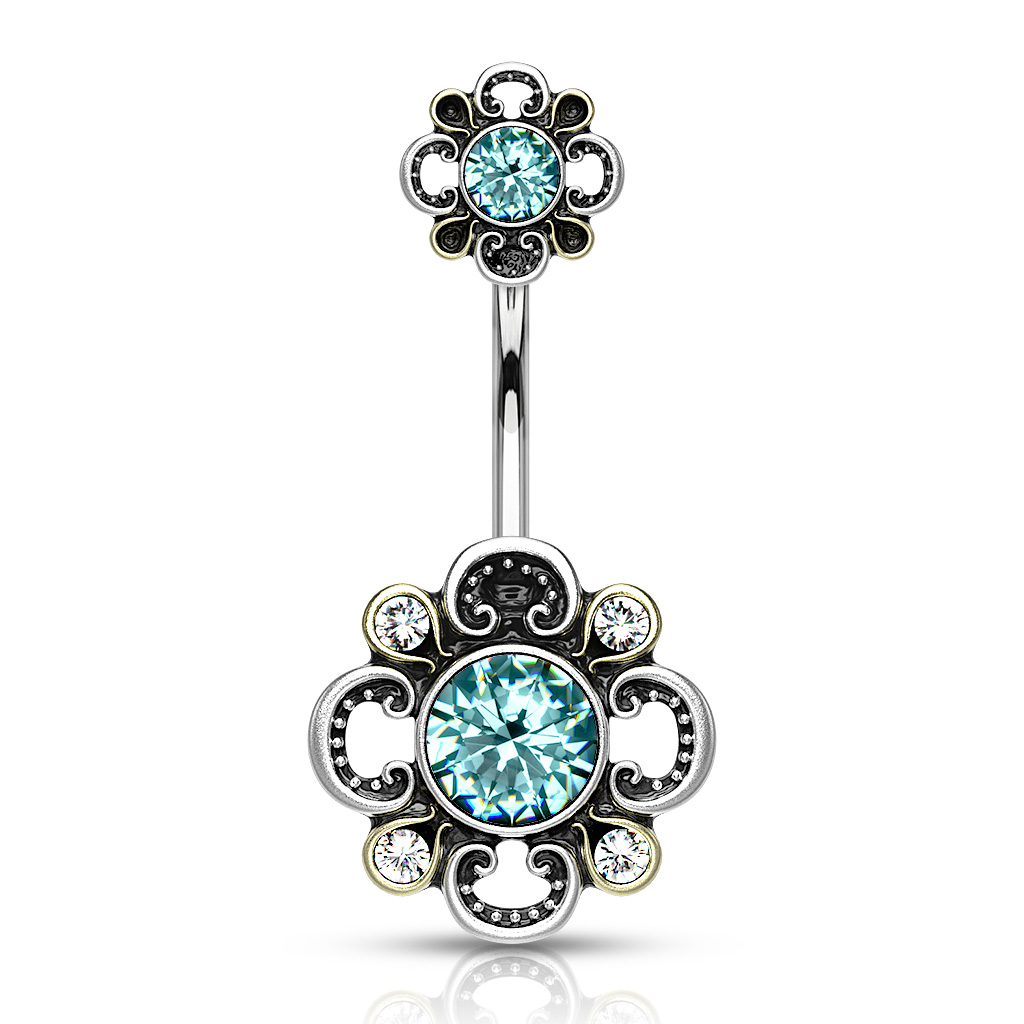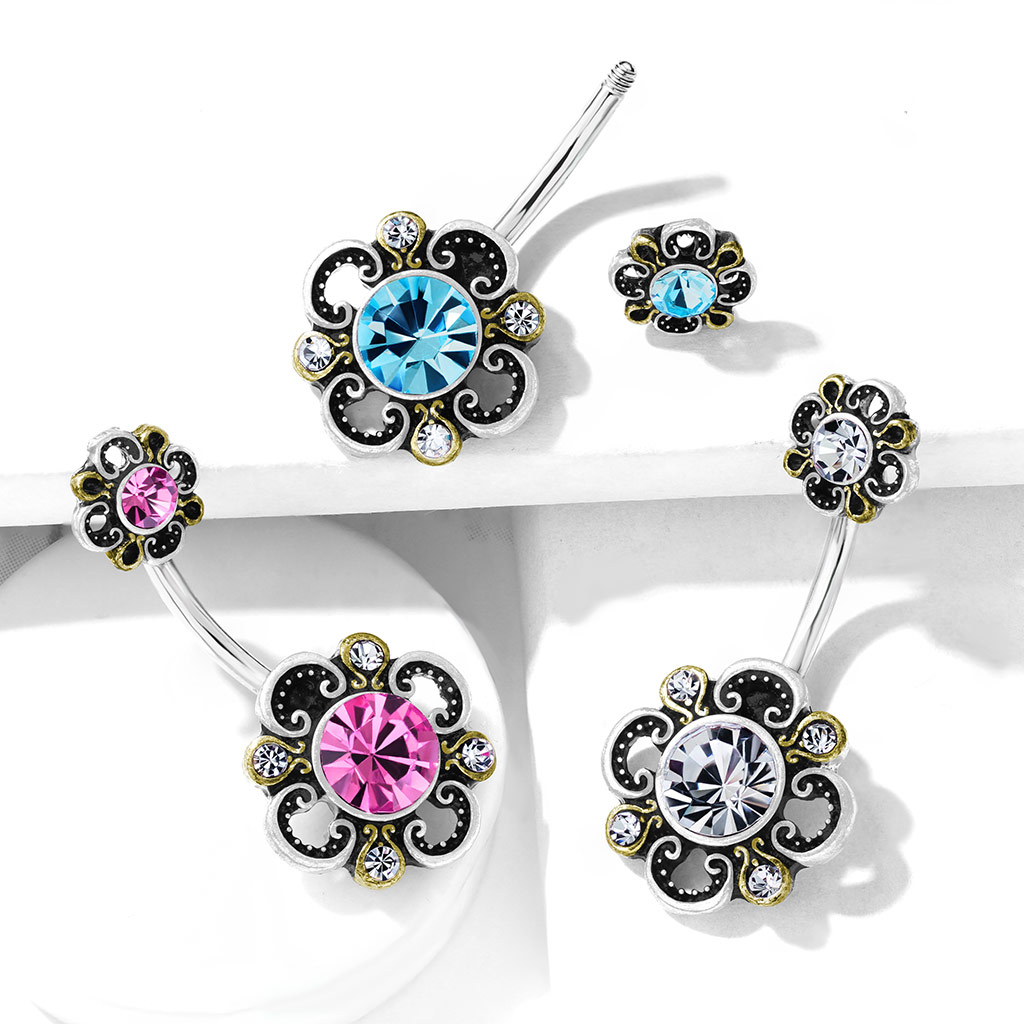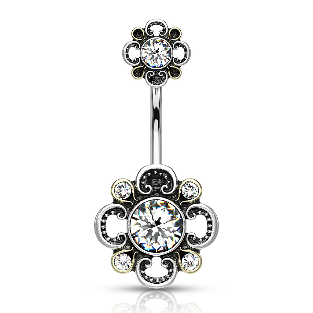 Kolczyk do pępka z filigranowym kwiatem i kamieniami