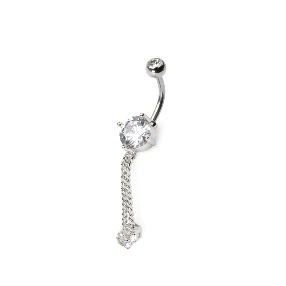 Piękny kolczyk do pępka to prawdziwa ozdoba. Zawieszka w formie łańcuszków na dole ozdobiona jest małymi kamieniami, które dodają elegancji i dynamizmu, co sprawia, że biżuteria jest wyjątkowa. Wykonana ze stali chirurgicznej zapewnia trwałość i wygodę. Pręcik ma 10 mm długości i gwint o grubości 1.6 mm. Łańcuszki znajdują się 28 mm od centralnego kamienia. Kolczyk dostępny jest w złotym, srebrnym i różowym kolorze, każdy zdobiony przejrzystymi kamieniami. Ten kolczyk do pępka stanie się doskonałym dodatkiem, który doda Tobie blasku.