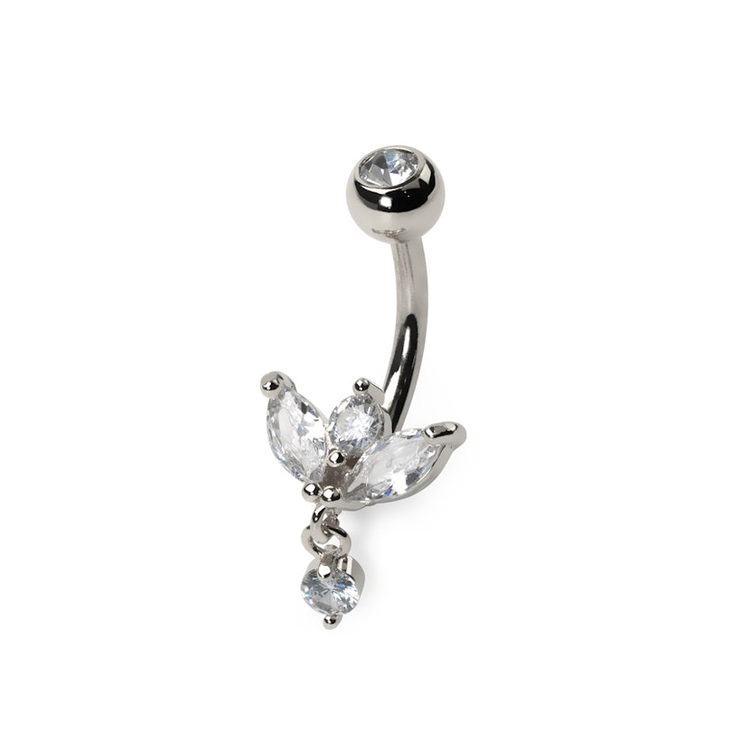 Przygotuj się na oślepiający blask w postaci kolczyka do pępka, wykonanego ze stali chirurgicznej i zdobionego trio cyrkonii w formie markizy oraz delikatną zawieszką z kamieniem. Stal chirurgiczna zapewnia trwałość i wygodę. Pręcik ma 10 mm długości, a gwint 1.6 mm grubości. Kolczyk dostępny jest w złocie, srebrze i różowym złocie wykończony przezroczystymi kamieniami. Ten wyjątkowy kolczyk nada Twojemu pępkowi blasku, a Tobie pewności siebie.
