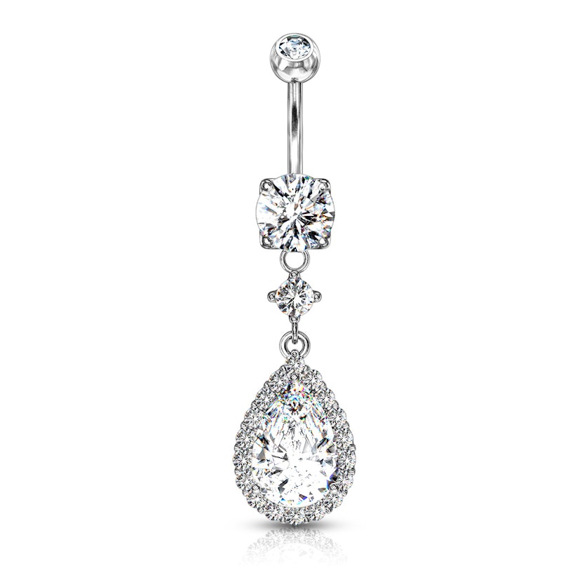 Ten prezentowany kolczyk do pępka zdobiony jest zawieszką z kamieniem w kształcie kropli. Krawędź, która go otacza jest wykonana z drobnych, przezroczystych cyrkonii. Nad kroplą znajduje się kolejny, mały kamień który łączy dolną kulkę z zawieszkę.