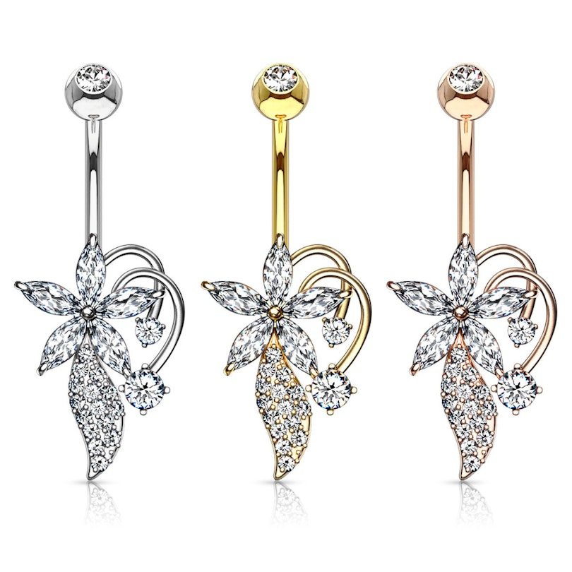 Kolczyk do pępka z kwiatem i kamieniami o szlifie markizy