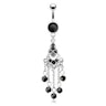 Wyjątkowy kolczyk do pępka o oryginalnym, gotyckim wzorze. Został wykonany ze stali chirurgicznej, w którym górna kulka ma klasyczny, srebrny kolor, natomiast dolna błyszczący i czarny odcień. Dolna część biżuterii jest również zdobiona czarnymi kamieniami, które stanowią cześć zawieszki.