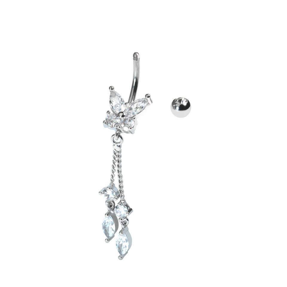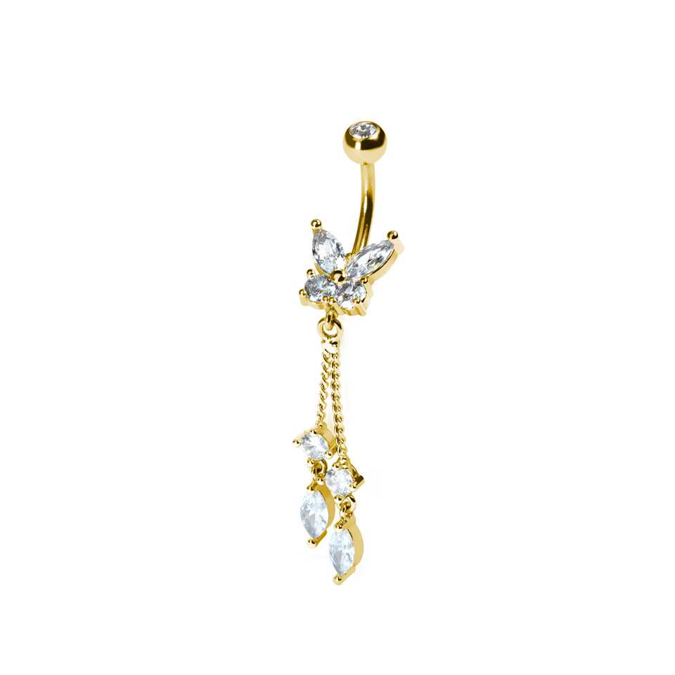 Ten błyszczący kolczyk do pępka zdobiony jest pięknym motylem w dolnej kulce, oraz zdobiony jest błyszczącymi kamieniami w łańcuszkach, które zwisają z motyla.