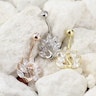 Prezentowany na zdjęciu kolczyk do pępka przedstawia motyw pawia. Jak wiemy rozwija on swoje skrzydła i eksponuje ich piękno, aby przyciągnąć samicę. W tej biżuterii pióra ogona prezentują podłużne kamienie, o szlifie markizy. W rzeczywistości paw nosi w sobie 100 do 150 piór, kiedy w tym kolczyku ozdobione są one siedmioma cyrkoniami.