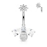 Kolczyk do pępka nie zawsze musi wyglądać tak samo i składać się z większej dolnej i mniejszej górnej kulki. Jak widać na powyższym zdjęciu, prezentowany model charakteryzuje duża kreatywność. Górna część wyposażona jest w mały kwiat z kamieniem, który ma wewnętrzny gwint i dzięki temu jest wygodny i bezpieczny w użyciu. W dolnej części pręcika, który ma 10 mm, widać większą kulkę, która razem ze skrzydłami przypomina ciało pszczoły. Skrzydełka są wykonane z kamieni, a ciało posiada drobne szczegóły, co sprawia że design jest bardzo realistyczny.