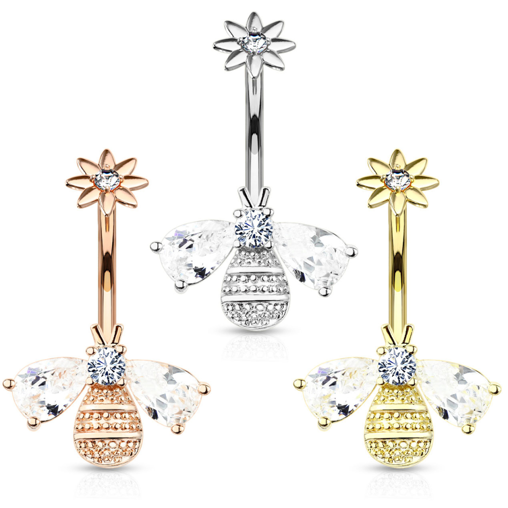 Kolczyk do pępka nie zawsze musi wyglądać tak samo i składać się z większej dolnej i mniejszej górnej kulki. Jak widać na powyższym zdjęciu, prezentowany model charakteryzuje duża kreatywność. Górna część wyposażona jest w mały kwiat z kamieniem, który ma wewnętrzny gwint i dzięki temu jest wygodny i bezpieczny w użyciu. W dolnej części pręcika, który ma 10 mm, widać większą kulkę, która razem ze skrzydłami przypomina ciało pszczoły. Skrzydełka są wykonane z kamieni, a ciało posiada drobne szczegóły, co sprawia że design jest bardzo realistyczny.