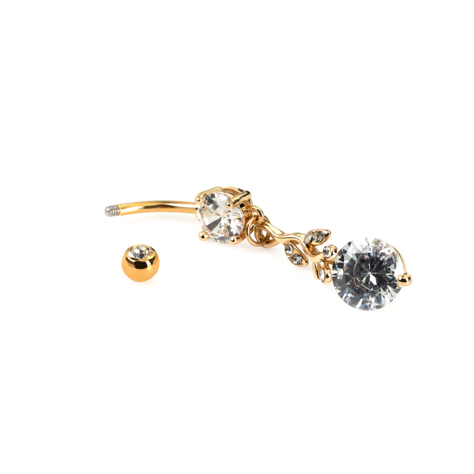 Im bardziej żywy kolczyk, tym bardziej przyciąga uwagę. Dotyczy to szczególnie tego kolczyka do pępka, co widać również na zdjęciu powyżej tekstu, który czytasz. Kolczyk został przymocowany do zawieszki, która została wykonana tak, aby wyglądała jak gałązka z liśćmi. Wspaniałe gałęzie i wspaniałe liście nadają biżuterii życia. Na dole kolczyka znajduje się duża cyrkonia. Poza tym kamieniem, kolczyk posiada kilka innych kryształków - w górnej kulce, duży okrągły kamień w dolnej kulce i małych jasnych kryształków na liściach zawieszki. Kamienie w dolnej części kuli i dolnej części wisiorka wytrzymywane są przy użyciu bardzo małych macek, które zapewnienia, że kryształki nie wypadają.