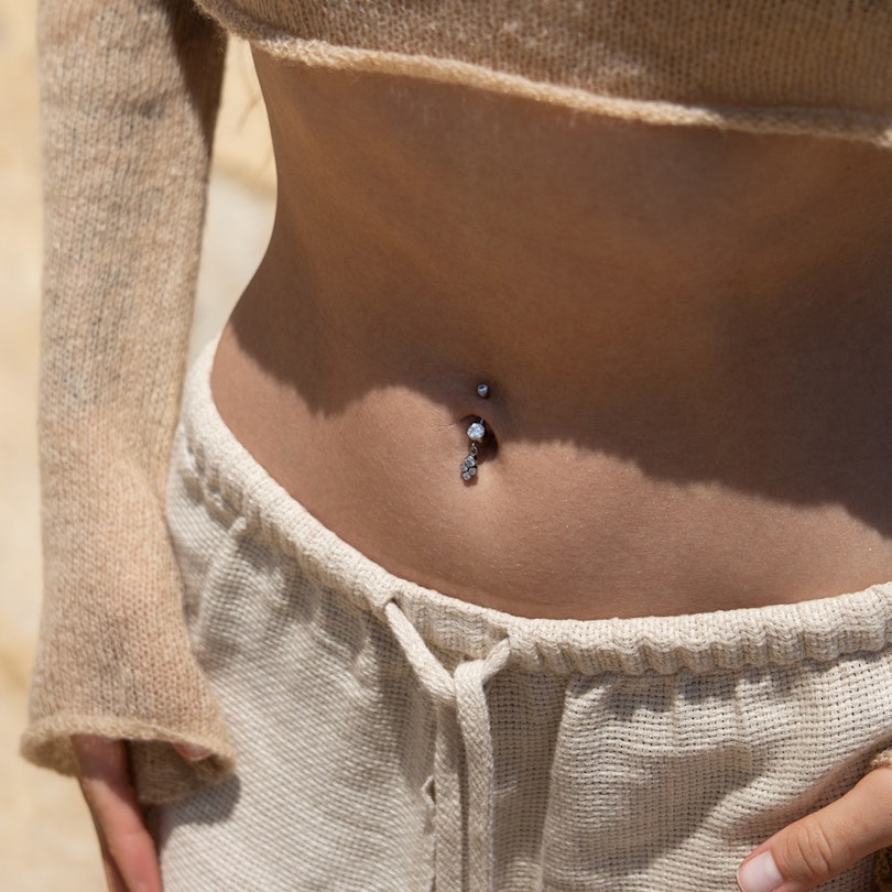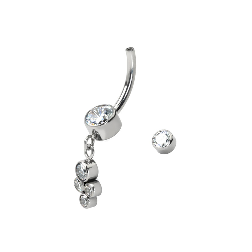 Ten kolczyk do pępka zachwyca ekstrawagancją 4 kamieni w zawieszce i większym, błyszczącym kamieniem w dolnej kulce oraz mniejszym na górze.