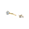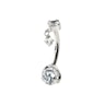 Ten piękny kolczyk do pępka ozdobiony jest okrągłą cyrkonią w dolnej kulce i mniejszą kwadratową w górnej, z której zwisa mała zawieszka z kulką. Wszystkie kamienie są zabezpieczone małymi ząbkami.