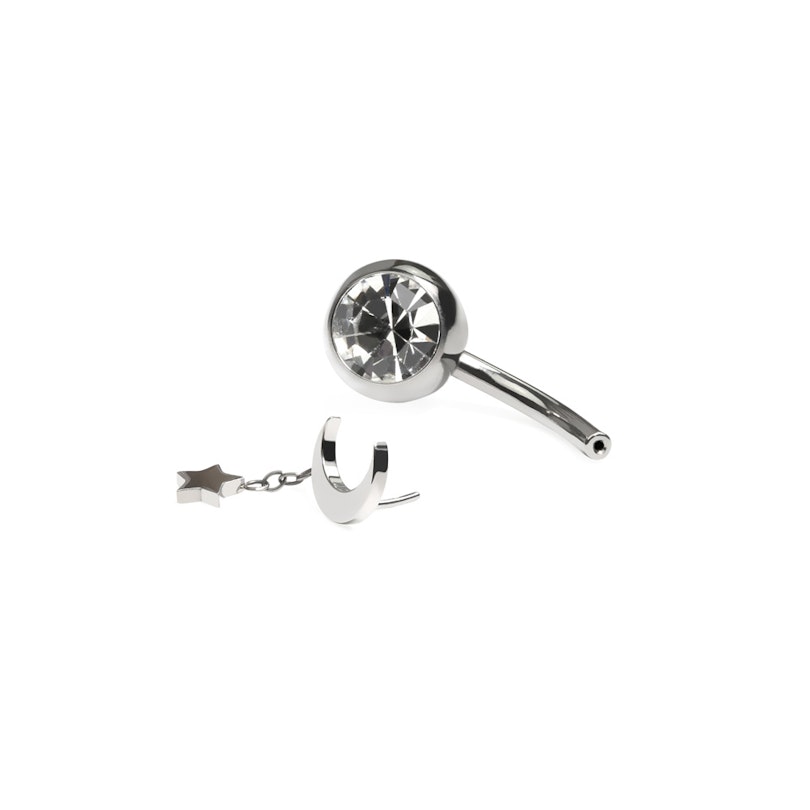 Ten kolczyk z tytanu do pępka zdobiony jest na górze księżycem z gwiazdką, która po włożeniu będzie się kołysać. Dolna kulka zdobiona jest oprawioną cyrkonią, która dodaje blasku biżuterii.