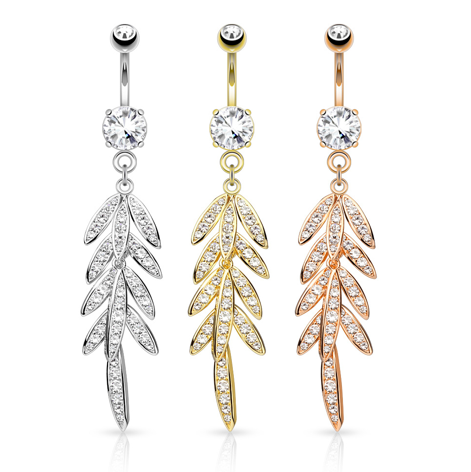 Ładna i elegancka biżuteria do pępka z zawieszką w formie liścia palmowego. Każda część liścia pozostaje ruchoma i jest udekorowana drobnymi brylancikami. W sumie biżuteria ta nosi w sobie 50 kryształków, które będą delikatnie się poruszać i błyszczeć podczas noszenia.