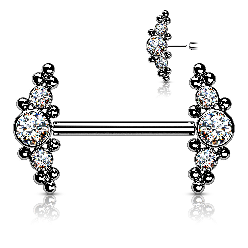 Nieważne czy masz jeden czy dwa piercingi w sutku, mamy tutaj dla Ciebie biżuterię o najwyższej jakości. Jest ona wykonana wyłącznie z tytanu, zarówno sztanga jak i końcówki zamykające, które są kombinacją małych kuleczek i kamieni. Większe kamienie znajdują się na środku, a mniejsze obok. Małe kuleczki są rozmieszczone wokół pięknych kamieni, co tworzy przepiękne skupisko tych elementów. Kamienie są zamontowane na stali, która jest płaska z tyłu. Dzięki temu biżuteria będzie dobrze ułożona na twojej piersi, w miejscu gdzie jest wykonany piercing.