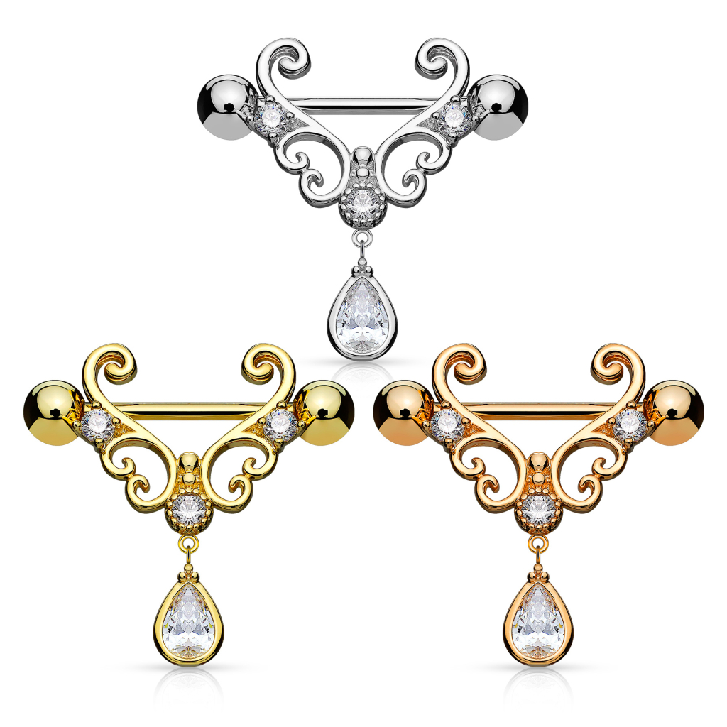 Jeśli spodobał się Tobie ten model nie ma wątpliwości, że przepięknie ozdobi twój sutek. Tarcza nosi w sobie cztery kamienie, największy ma kształt kropli i zawieszony jest pośrodku. Poza tym biżuteria zdobiona jest także zawijasami i sercami co stanowi doskonałe wykończenie projektu.