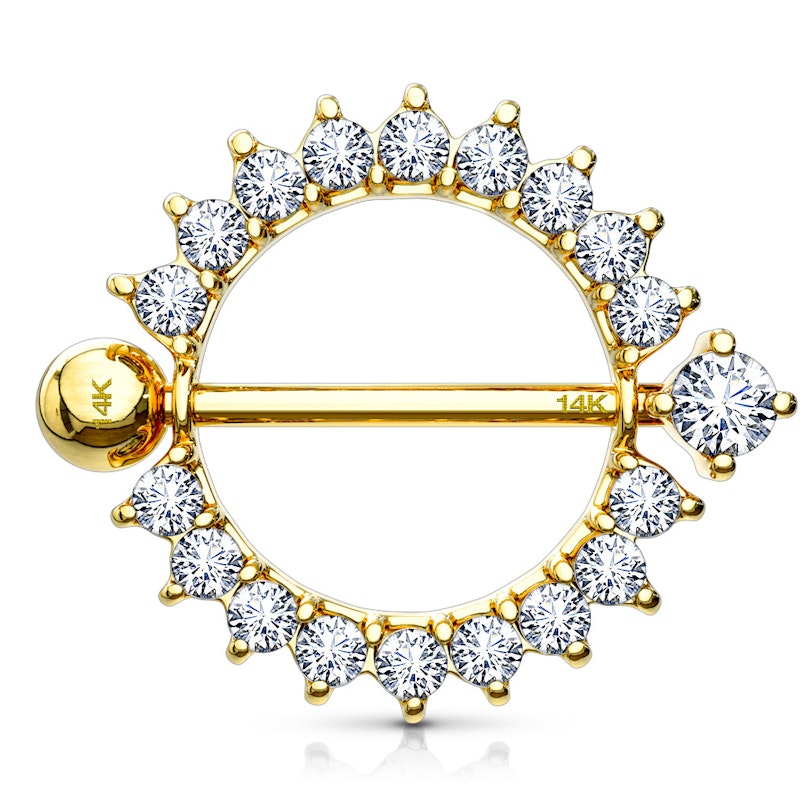 Szukasz eleganckiego kolczyka do sutka o wysokiej jakości? Teraz masz okazję ozdobić go złotą tarczą z 14 karatowego złota, zdobioną wzdłuż krawędzi jasnymi cyrkoniami. Dzięki błyszczącym kamieniom biżuteria przypomina słońce, które mieni się w promieniach światła. Każda z cyrkonii jest bezpiecznie osadzona w podstawie i nie jest przyklejana. Kulki, które zamykają kolczyk mają 4 mm i są wyposażone w gwint. Jedna z nich jest wykonana ze złota, kiedy druga ozdobiona jest dużym, jasnym kamieniem. Ta ostatnia nie tylko zdobi tarczę, lecz pełni praktyczną funkcję, gdyż możesz ją łatwo zakręcać i odkręcać trzymając przeciwną kulkę.