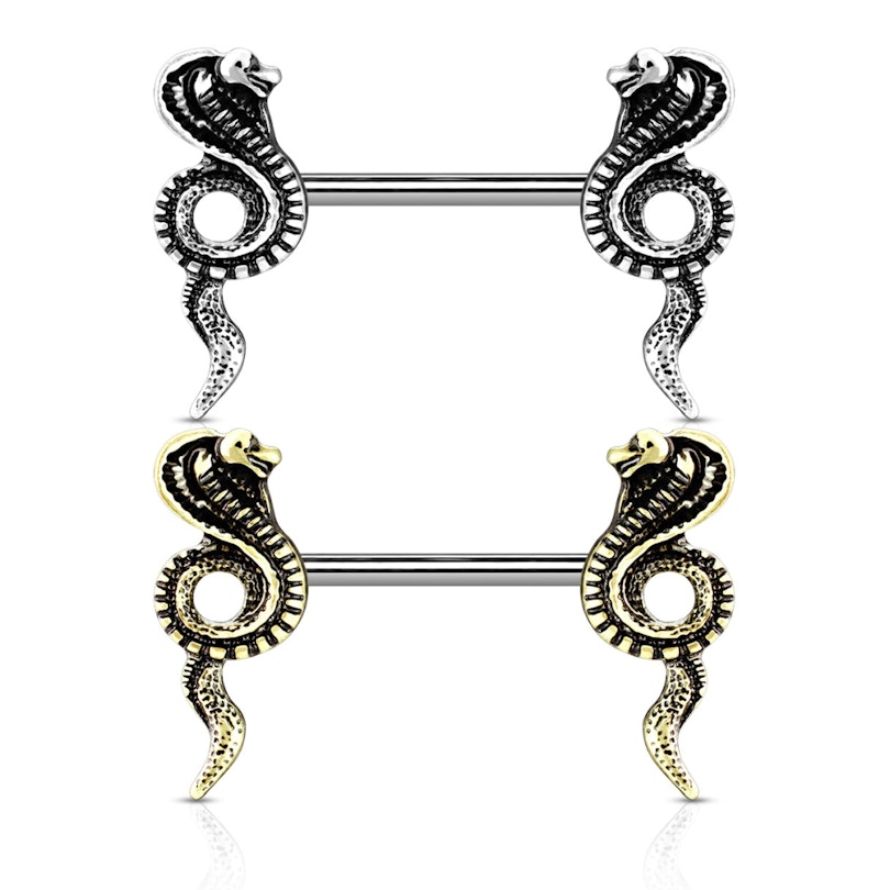 Biżuteria jest dostępna w dwóch kolorach: srebrnym oraz starego złota. Węże są wykonane z mosiądzu i zostały powleczone jednym z wspomnianych kolorów. Pamiętaj, że jedna kobra jest na stałe przyklejona do kolczyka, co zapewnia symetrię.