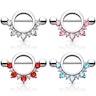 Dolna część ozdobiona jest okrągłymi kamieniami w kolorach do wyboru. Łuk zawiera pięć dużych kamieni i pięć mniejszych ułożonych naprzemiennie. Mniejsze są przezroczyste, a duże mają różne kolory, które odnajdziesz w naszym menu obok zdjęcia. Jeśli lubisz klasykę polecamy ten z przezroczystymi kamieniami, ale jeśli chcesz ożywić swój piercing sutka, wybierz czerwony, różowy lub turkusowy.