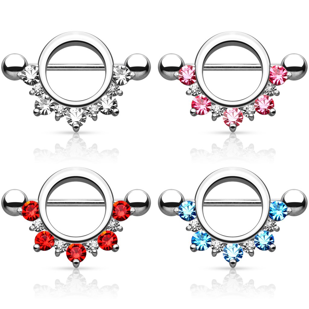 Dolna część ozdobiona jest okrągłymi kamieniami w kolorach do wyboru. Łuk zawiera pięć dużych kamieni i pięć mniejszych ułożonych naprzemiennie. Mniejsze są przezroczyste, a duże mają różne kolory, które odnajdziesz w naszym menu obok zdjęcia. Jeśli lubisz klasykę polecamy ten z przezroczystymi kamieniami, ale jeśli chcesz ożywić swój piercing sutka, wybierz czerwony, różowy lub turkusowy.