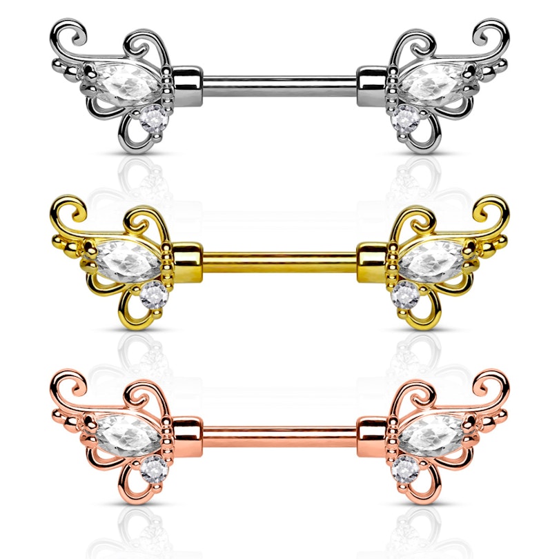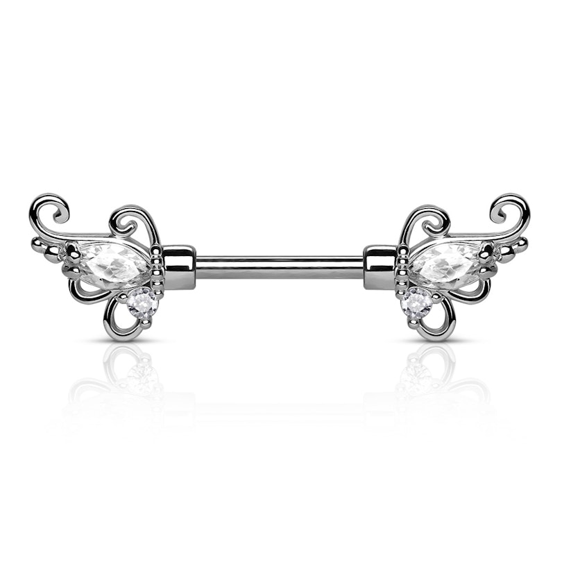 Biżuteria, którą podziwiasz na zdjęciu jest przeznaczona do piercingu sutka. Pręcik ma długość 12 mm i zamykany jest bajkowymi, skręconymi motywami, które na końcach zdobione są przezroczystymi kamieniami.