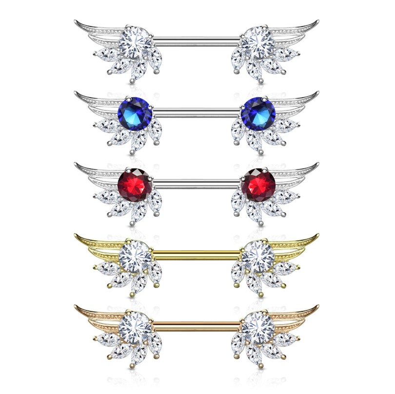 Ta sztanga jest prosta i ma długość 14 mm. Dwa końce są ozdobione motywem przypominającym skrzydło. Są one szpiczaste, a każde z nich posiada duży, okrągły kamień, oraz cztery owalne markizy, które są do niego przymocowane. Każde skrzydło ma 13 mm i dodaje biżuterii symetrii.