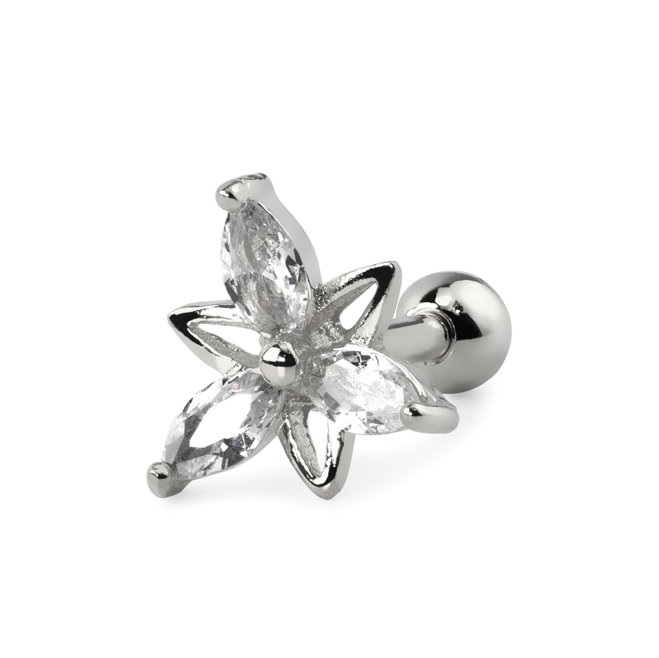 Przyglądając się tej biżuterii być może skojarzysz ją ze znaną zabawką fidget spinner. Musimy jednak wyprowadzić Ciebie z błędu, ponieważ w rzeczywistości jest to kwiat o trzech płatkach, osadzony na pręciku ze stali chirurgicznej. Model ten nadaje się idealnie do noszenia w uchu. Możesz go użyć w przekłuciu helix, tragus lub po prostu w płatku ucha. Wykorzystaj go też w innych częściach ciała, najważniejsze aby pasował rozmiarem do przekłucia oraz do miejsca, w którym go umieścisz. Nie będzie on odpowiedni do piercingu wargi, gdyż kulka zamykająca kolczyk znajduje się w jego dolnej części. Ma ona wielkość 3 mm, a pręcik długość 6 mm i grubość 1,2 mm. Sam kwiat jest wykonany z mosiądzu, a całość biżuterii została powleczona rodem lub 14 karatowym złotem w zależności od wybranego modelu.